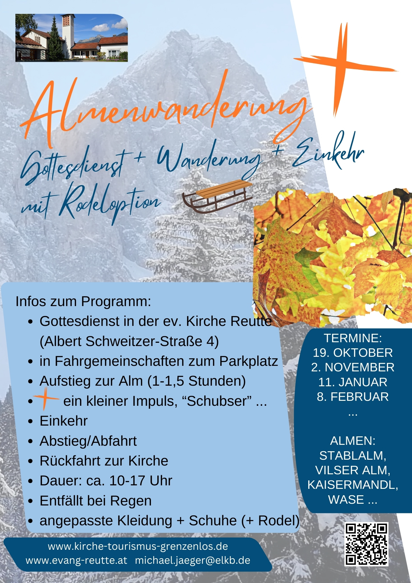 Was Sie/Euch erwartet: Erst einmal ein Gottesdienst in der evangelischen Kirche Reutte (Albert-Schweitzer-Straße 4). Dann fahren wir mit Autos in Fahrgemeinschaften zu einem nahegelegenen Wanderparkplatz und steigen von dort zu einer netten Alm auf, wobei es unterwegs etwas zum Glück gibt, kehren ein und „stürzen“ uns anschließend zu Fuß, oder auf Rodeln, wieder ins Tal. Bleibt noch die Rückfahrt zur Kirche.